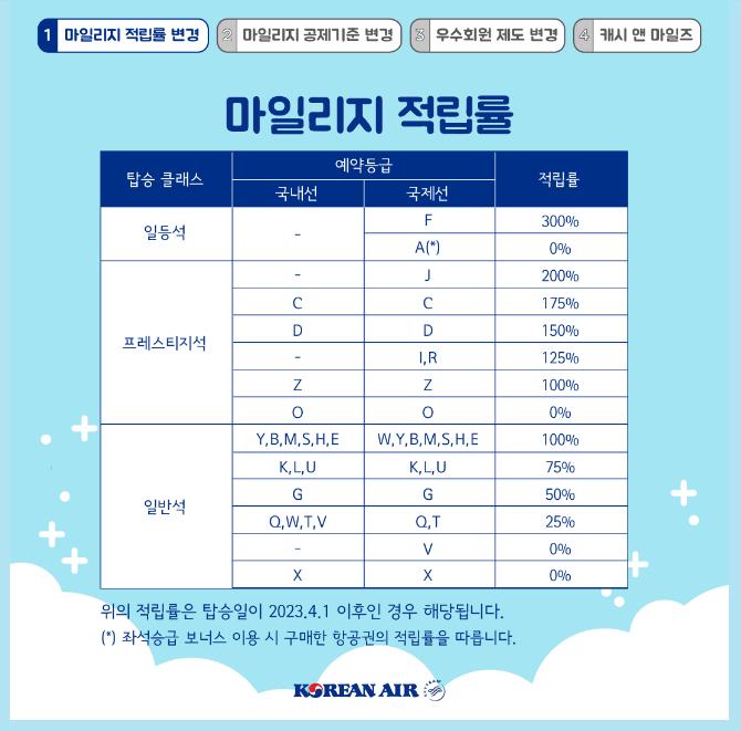 대한항공 마일리지 개편 (2023년 4월 1일부터 시행) 하는 항목 들은 크게 4가지로 마일리지 적립률 변경, 마일리지 공제 기준 변경, 우수회원 제도 변경, 캐시 앤 마일즈입니다.
