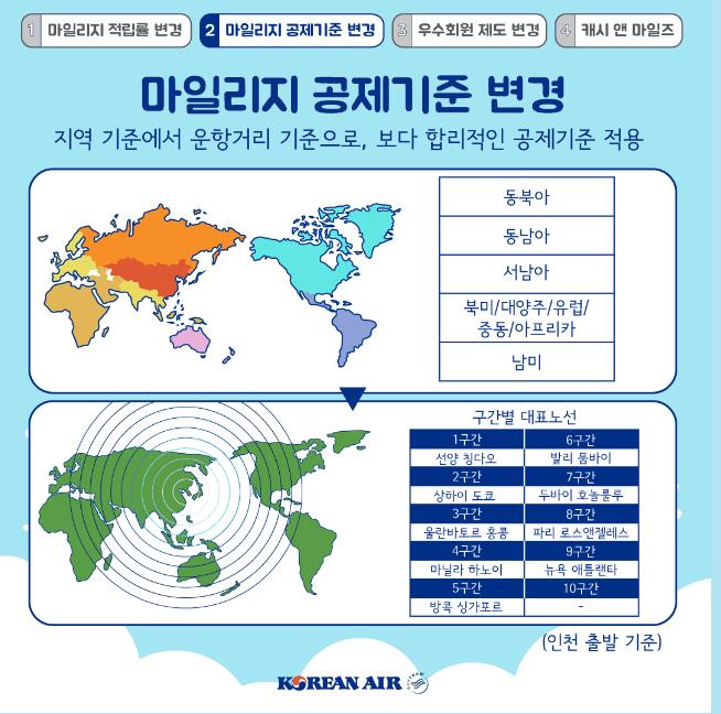 대한항공은 기존 국내선은 편도 5000마일, 국제선은 동북아시아, 동남아시아, 서남아시아, 미주/유럽/중동 등 네 지역으로 나누어 마일리지를 공제했습니다. 2023년 4월부터는 실제 운항 거리별로 10구간으로 나누어 마일리지 공제 기준을 세분화하였습니다.