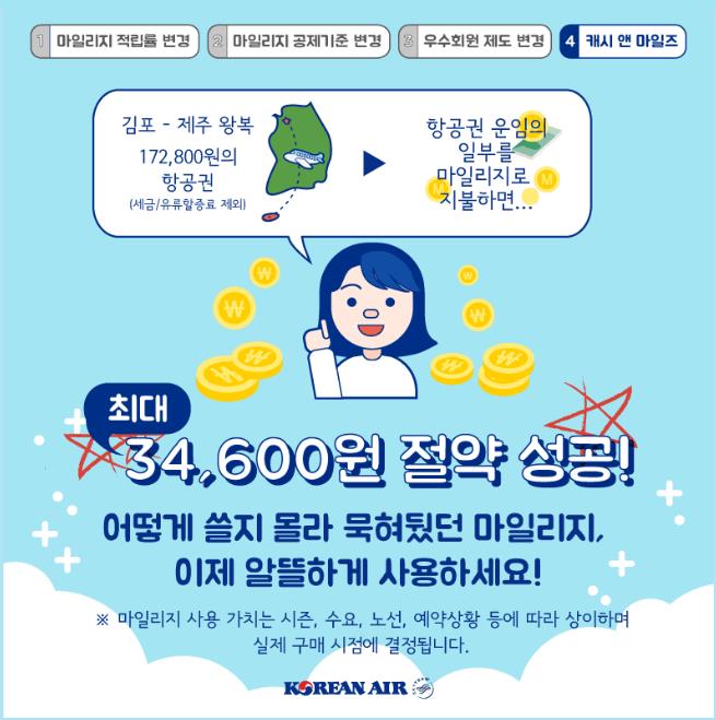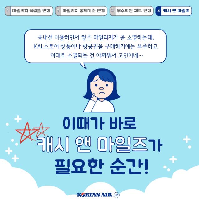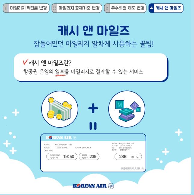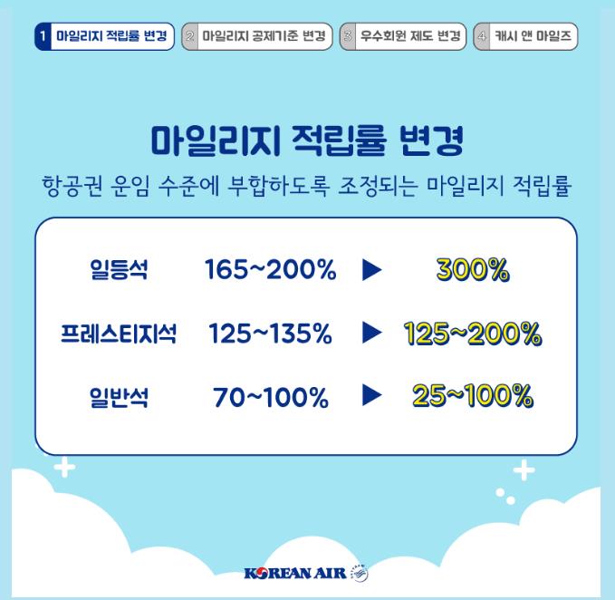 대한항공 마일리지 개편 (2023년 4월 1일부터 시행) 하는 항목 들은 크게 4가지로 마일리지 적립률 변경, 마일리지 공제 기준 변경, 우수회원 제도 변경, 캐시 앤 마일즈입니다.