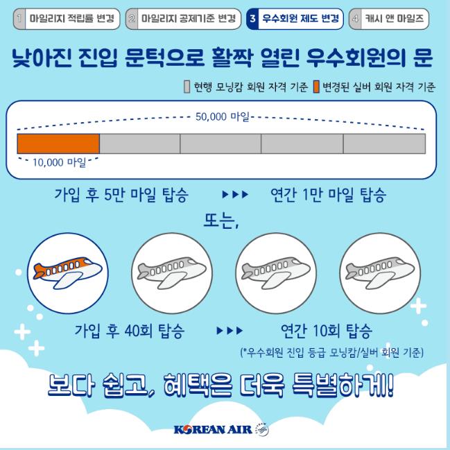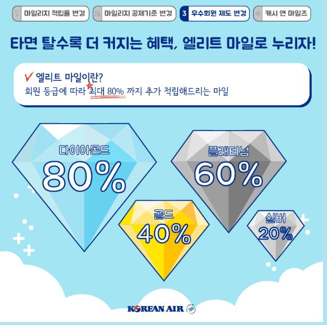대한항공 우수회원 제도도 변경됩니다. 기존 모닝캄 클럽, 모닝캄 프리미엄 클럽, 밀리언 마일러 클럽에서 실버, 골드, 플래티넘, 다이아몬드로 변경 됩니다. 모닝캄은 정해진 탑승 마일리지나 탑승 횟수를 충족해야 자격을 얻었지만 개편 이후 신규 회원이라도 실적이 우수하면 다이아몬드 회원이 될 수 있습니다. 회원 등급에 따라 최대 80%까지 추가 적립되는 엘리트 마일도 추가되었습니다.