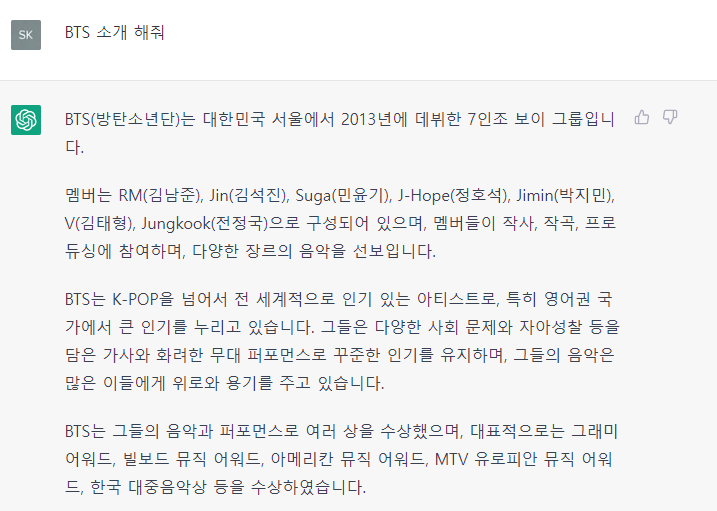 ChatGPT로 BTS 소개를 질문 후 받은 답변