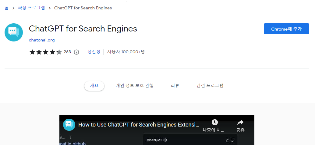 우선 구글 크롬 브라우저에서 ChatGPT for Search Engines을 검색하면 웹스토어 페이지로 이동합니다.