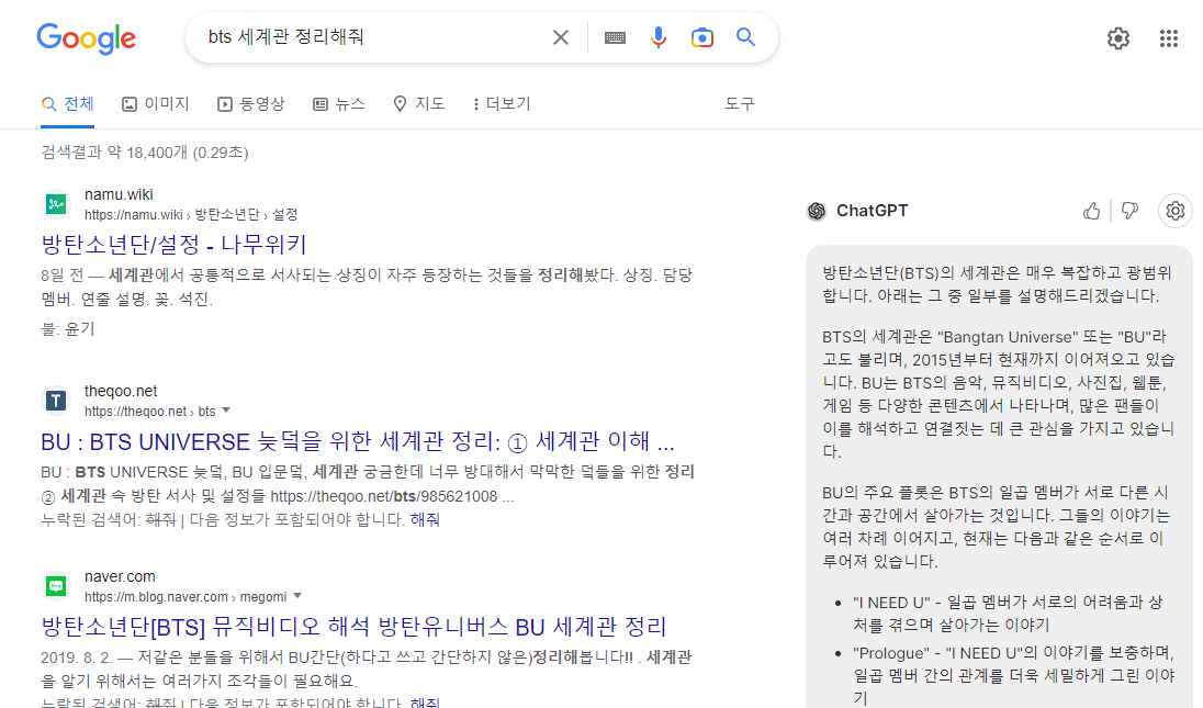 BTS 세계관에 대해서 검색해 달라고 요청을 했더니 답변이 자세히 나오는 것을 확인할 수 있습니다.