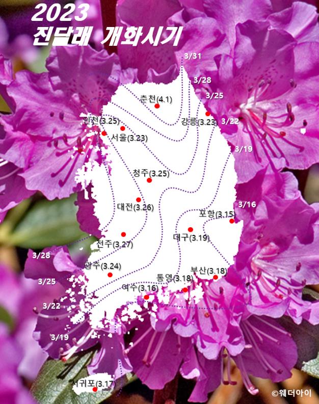 진달래는 3월 17일 서귀포를 시작으로 남부지방은 3월 15-27일, 중부지방은 3월 23-29일, 경기 북부와 강원 북부 및 산간지방은 4월 1일 이후 개화 할 것으로 예상 됩니다.
