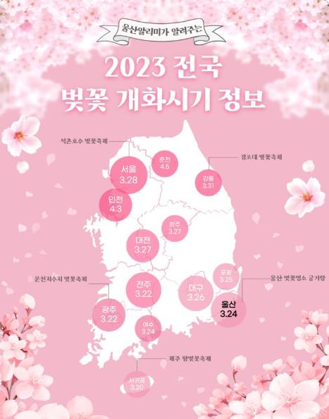 울산 알리미에서 발표한 2023년 벚꽃 개화 시기에 따르면 제주도에서 3월 20일로 가장 빠른 벚꽃을 볼 수 있습니다. 따듯한 남쪽 제주는 작년과 동일하게 조금 일찍 개화를 한다고 예상했습니다. 가장 늦은 지역은 춘천으로 4월 5일 개화 시기를 예상했습니다.