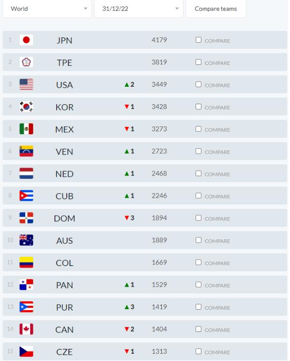 WBC 공식 홈페이지에서는 각 나라의 세계 랭킹을 확인할 확인할 수 있습니다. 2022년 12월 31일을 기준으로 확인을 해 보았습니다. 한국은 일본, 대만, 미국에 이은 세계 랭킹 4위에 기록되어 있으며 아시아 랭킹 3위에 올라와 있는 모습을 확인할 수 있습니다.