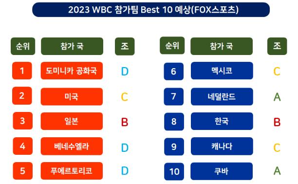 FOX 스포츠에서 발표한 2023 월드 베이스볼 클래식 참가팀 Best 10의 1위는 3회 차 우승 경험이 있는 도미니카 공화국이었습니다. 강력한 우승 후보인 일본도 3위에 올랐습니다. 2022년 내셔널리그 사이영상 수상자인 선발 샌디알칸타라와 크리스티안 하베이르 선수 투수 진과 라인업이 매우 화려하여 도미니카 공화국의 1위 예상을 꼽았습니다.