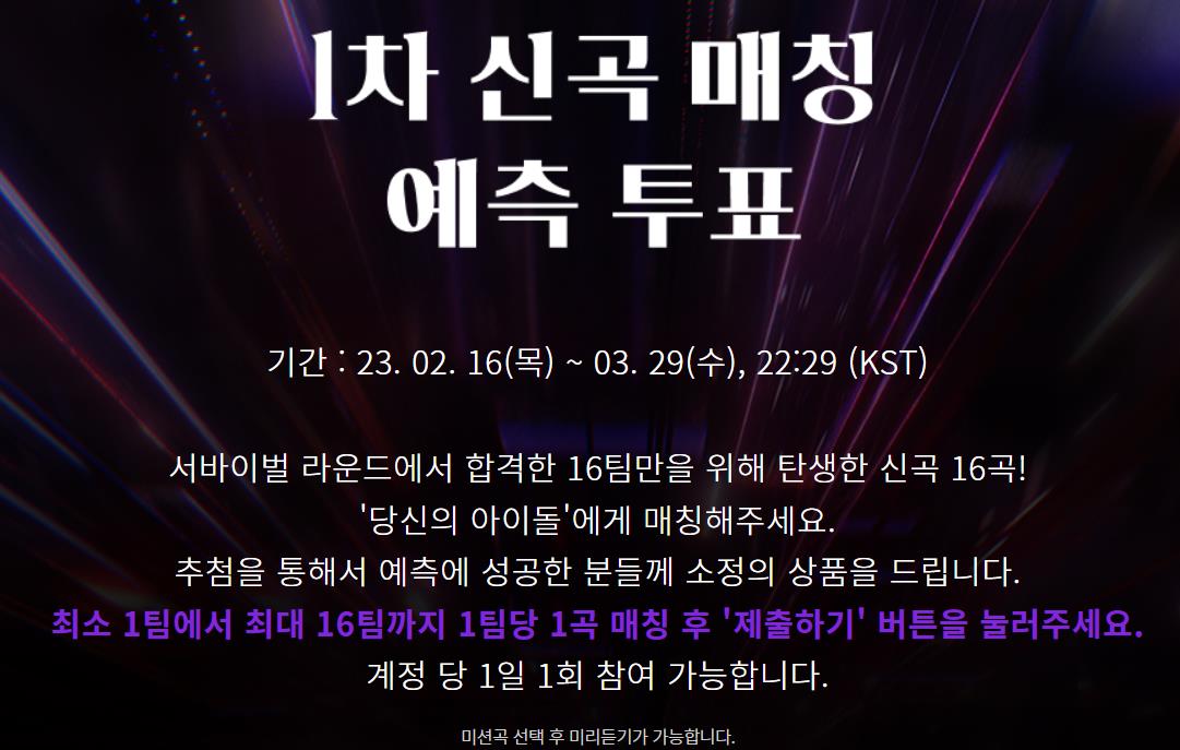 동시에 1차 신곡 매칭 예측 투표도 진행 됩니다. 서바이벌 라운드에서 합격한 16팀 만을 위한 신곡 16곡을 아이돌의 이미지에 맞게 매칭하여 투표해줄 수 있습니다. 최소 1팀에서 최대 16팀까지 1팀당 1곡 매칭 후 '제출하기' 버튼을 누르면 투표 가능 합니다. 투표는 계정 당 1일 1회 참여 가능 합니다.