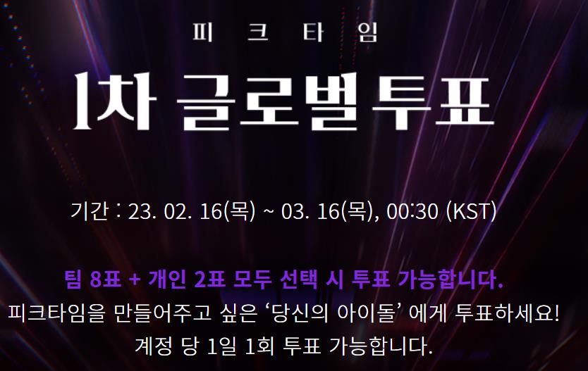 첫 방송이 시작됨과 동시에 1차 글로벌 투표가 진행되었습니다. 본선 진출 아이돌 23팀은 피크타임이라는 이름에 알맞게 시간대로 팀명을 정해두고 1시부터 23시까지 총 23팀이 참여하였습니다. 투표 기간은 2023년 02월 16(목) 부터 2023년 03월 16(목) 00시 30분까지 진행됩니다.