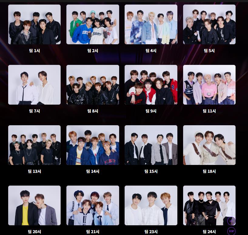 팀 투표에 앞서 어떤 팀들이 있는지 확인 해보도록 합니다. 피크타임(PEAK TIME) 본선에 진출한 그룹은 총 23팀입니다. 각 팀들은 남자 아이돌로 데뷔한 이력이 있습니다. 각 팀들은 2020년부터 2022년까지 데뷔 경험이 있습니다. 각 팀에 대해서는 아래 이미지를 클릭하시면 확인하실 수 있습니다.