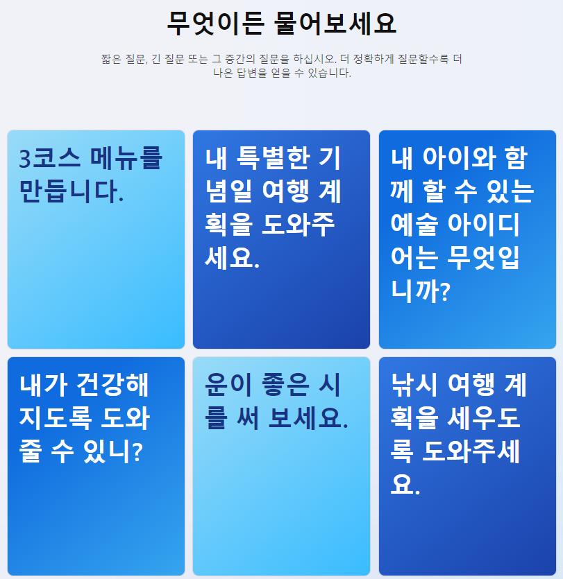 광범위한 질문은 검색을 통해 제공된 링크를 이용하여 자세히 알아보거나 채팅 기능에서 세분화 된 결과값을 요청할 수 있습니다.