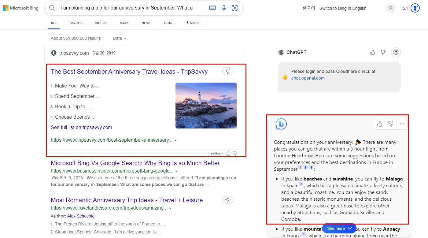 저는 두 번째 질문 예시인 특별한 기념일 여행 계획을 선택해 보았습니다. 질문을 선택 하면 새로운 창에서 질문에 대한 검색 결과 화면이 왼쪽에 보여지고 오른쪽으로는 새로운 기능의 검색 결과가 보여집니다. 마치 오픈AI의 챗GPT 처럼 말입니다.